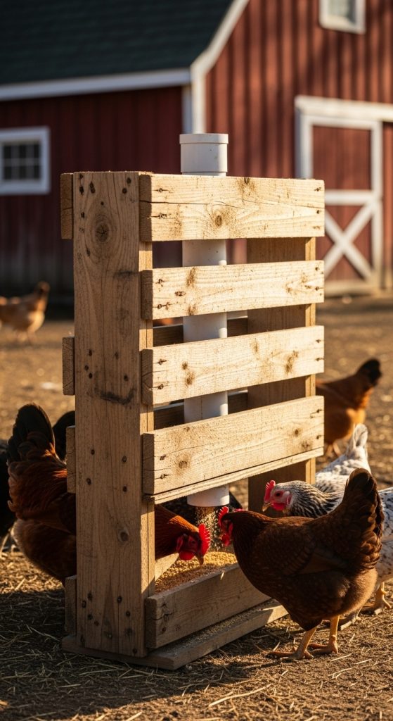 For a large flock, you can build a gravity-fed feeder using reclaimed pallet wood and an old PVC tube hidden inside. The wood exterior gives it a vintage handmade look, while the PVC pipe ensures smooth feed flow.