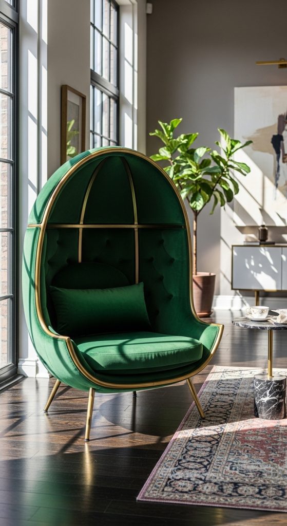 For a truly dramatic effect, consider a canopy or egg chair. These designs envelop the sitter, creating a cozy, private haven. Often available in plush fabrics like velvet or chenille, canopy and egg chairs make a bold luxury statement. They’re perfect for corners with natural light or as a focal point in a modern lounge area.