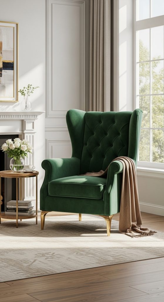 The classic wingback chair gets a luxurious twist with rich velvet upholstery. Its high back and elegant curves not only provide comfort but also create a visual anchor for any room. Choose jewel-toned shades like emerald, sapphire, or deep burgundy to add a regal touch. Gold or brass legs can elevate the chair’s glamour, making it a perfect statement piece for living rooms or study corners.