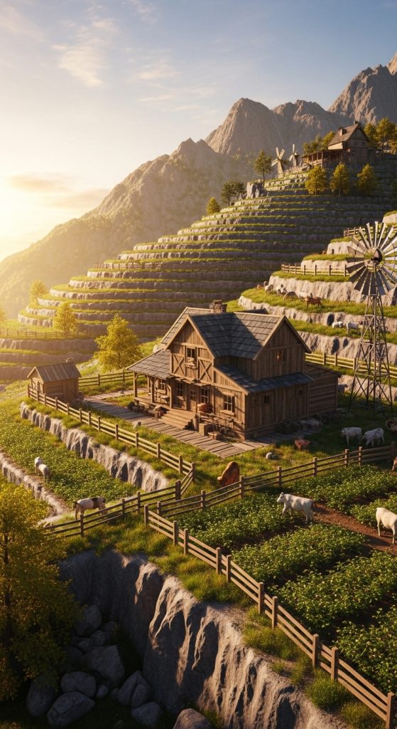 Who says farms must be on flat land? Build a small farmhouse on a mountain plateau with terrace farming below it.