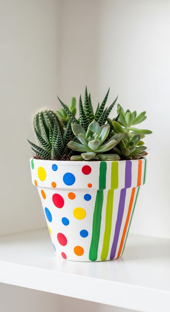 Add whimsy with playful polka dots, stripes, or abstract patterns. These cheerful designs are perfect for kids’ rooms, craft corners, or as a fun gift. You can mix large and small dots or use contrasting colors to make the pots pop. Even a single color on a bright background can make a charming statement.