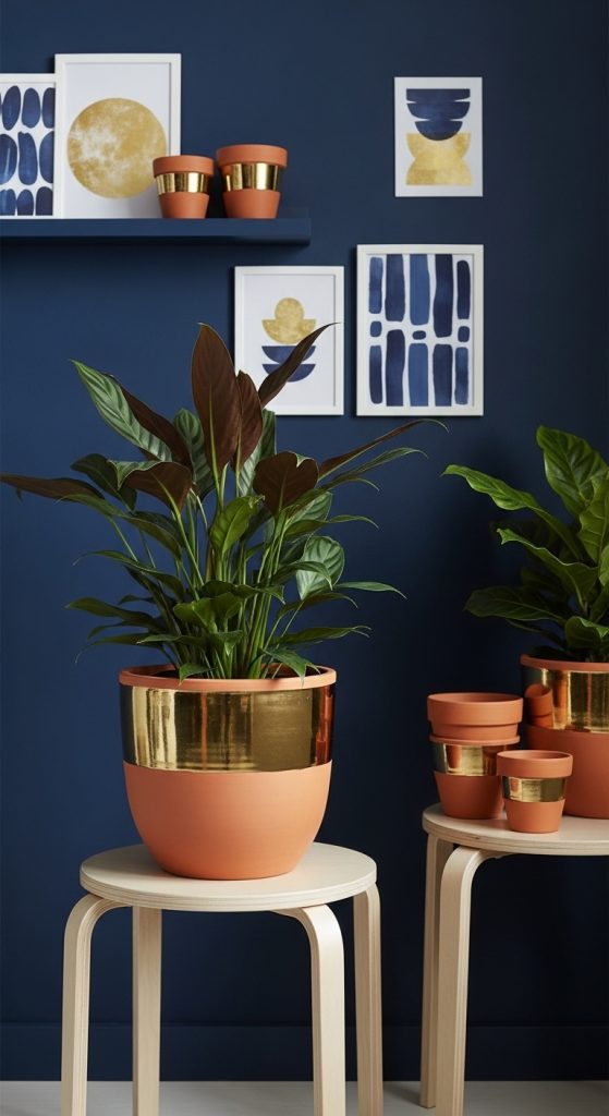 Introduce a touch of glamour by adding metallic details. Gold, silver, or copper paint highlights can turn a simple terracotta pot into a chic decor piece. Try painting the rim, handles, or even small patterns in metallic shades. These pots are ideal for weddings, elegant events, or sophisticated indoor plant displays.
