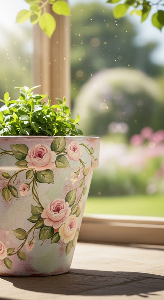 Embrace the natural theme by painting delicate floral or botanical motifs on your pots. Small hand-painted roses, daisies, or leafy vines instantly add elegance. For a more rustic look, pair earthy terracotta with muted pastel paints. These pots can become the centerpiece of a cozy garden corner or a bright accent indoors.