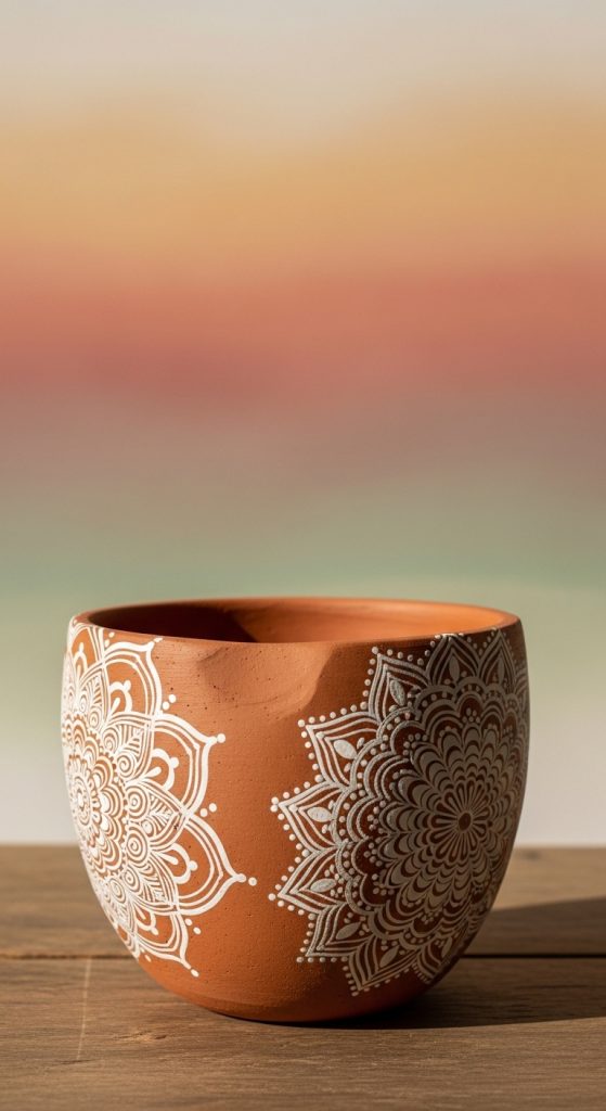 Capture the spirit of bohemian decor by painting intricate mandalas or tribal patterns. Use thin brushes to create symmetrical designs and fill the pot with dots, lines, and curves. A combination of white and earthy colors against the terracotta background brings a soothing, handcrafted look. These pots are perfect for meditation corners or artistic indoor spaces.