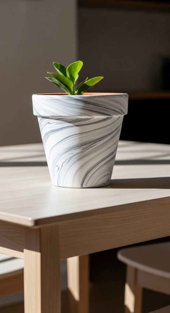 Use paint to mimic natural textures like wood grain, stone, or even marble. This creative approach gives terracotta pots a high-end, artistic look without expensive materials. You can mix colors and use sponges, brushes, or even crumpled paper to achieve realistic textures. These textured pots blend seamlessly with garden settings or modern interiors.