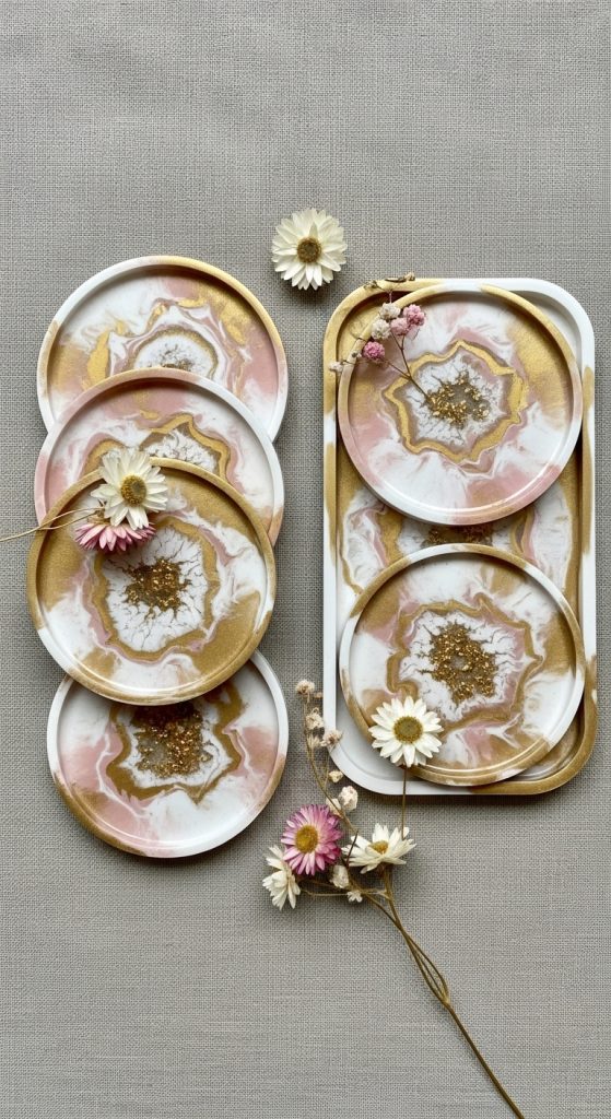 Use resin, acrylic, or pour paint techniques to create elegant coasters or small serving trays. You can embed gold flakes, metallic pigments, dried petals, or marbling effects. Pair with a felt coaster holder or gift box.