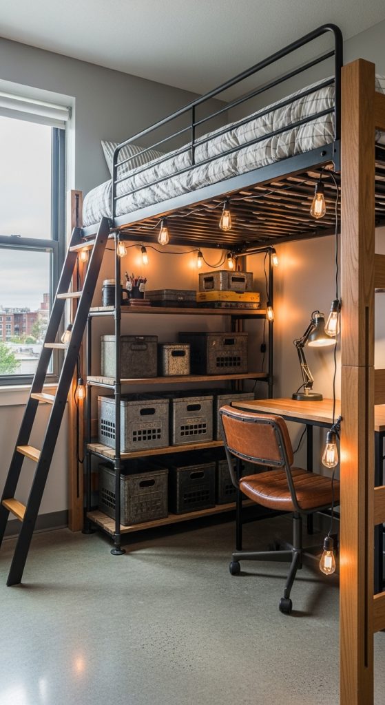 Why it works: The industrial touch paired with vintage accents creates a loft room that looks urban and lived-in — perfect for a dorm with minimal space.