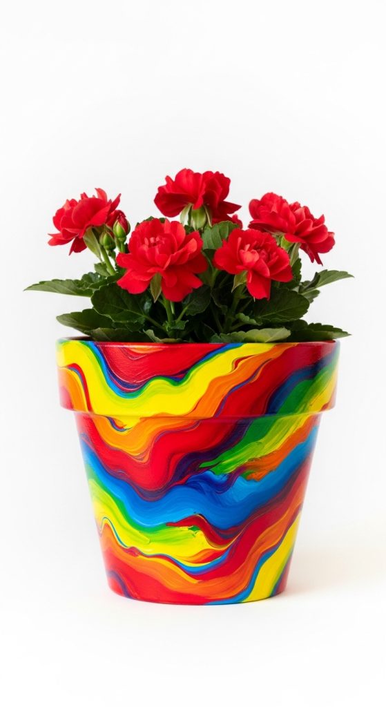 Abstract designs let your creativity run wild. Use bold splashes of color, swirling patterns, or freeform shapes. Abstract flower pots become statement pieces and can match eclectic, modern, or artistic décor themes. This idea is perfect for adults and kids alike who love to play with color and shapes.
