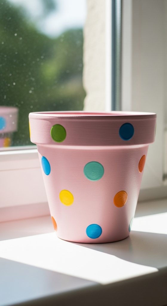 Polka dots are timeless, playful, and surprisingly easy to create. Start with a solid base color, like a soft pastel or a neutral cream, then add dots of varying sizes using a small brush or the end of a pencil. Mix and match colors for a cheerful look or stick to a monochromatic scheme for a chic effect. This design works well for both small and large pots and can brighten up a windowsill instantly.
