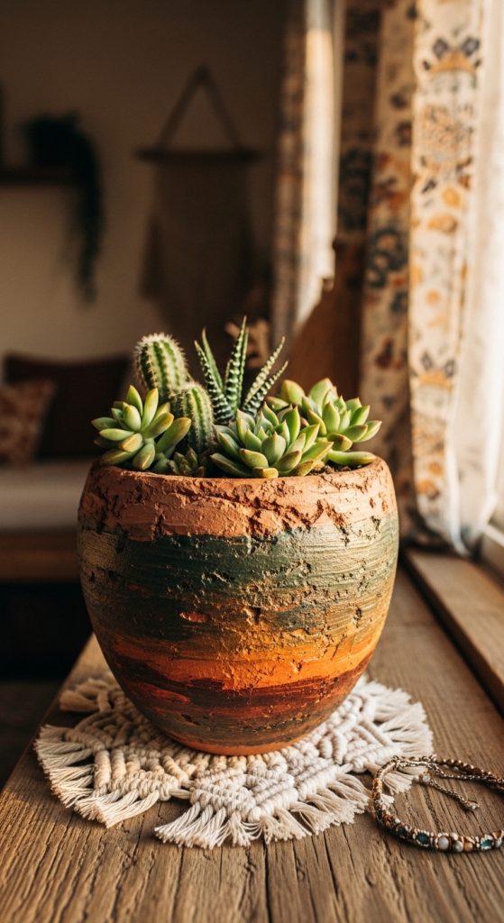 Sometimes, imperfection is perfection. Hand-painted rustic pots with rough brush strokes, uneven lines, and earthy tones can create a cozy, bohemian feel. Pair these with succulents or herbs for a warm, natural look.