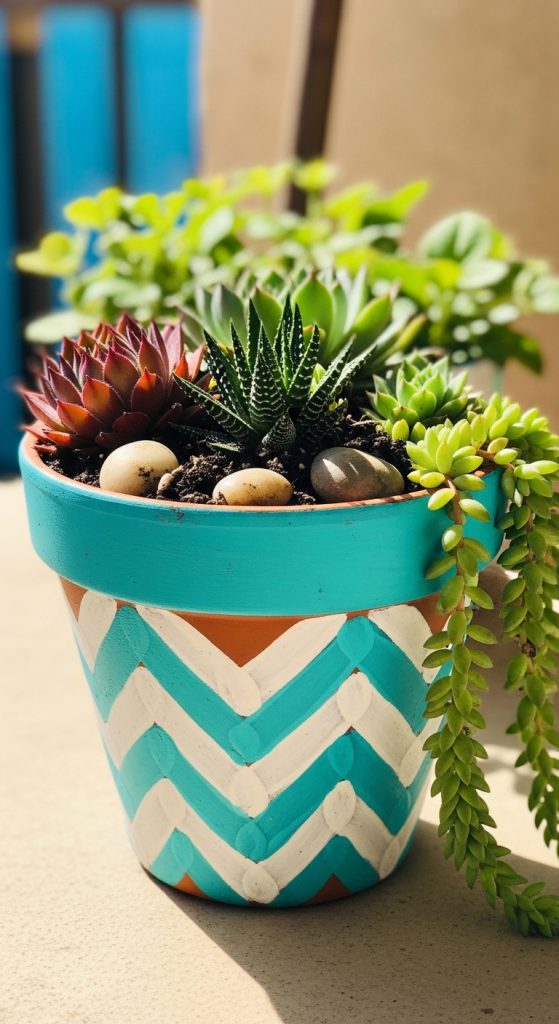 Chevron patterns bring a sense of movement and style to any pot. Using two contrasting colors, create zigzag lines all around the pot. This pattern is bold, eye-catching, and works beautifully with geometric and minimalist home décor. For a playful touch, mix bright hues or pastel shades.