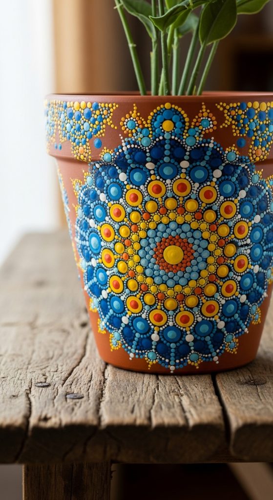 Mandala-inspired dot patterns can turn a simple pot into a work of art. Using different dot sizes and colors, create intricate circular patterns that radiate from the center. This meditative style is not only satisfying to create but also visually captivating when displayed.