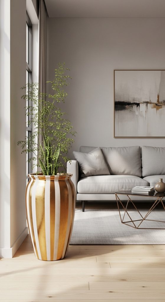 Stripes are classic and versatile. Vertical stripes can make a pot look taller, while horizontal stripes add a modern twist. You can opt for thin, delicate lines or bold, wide bands. Metallic paints like gold or copper paired with a neutral base can create an elegant, high-end vibe, perfect for a living room or patio display.