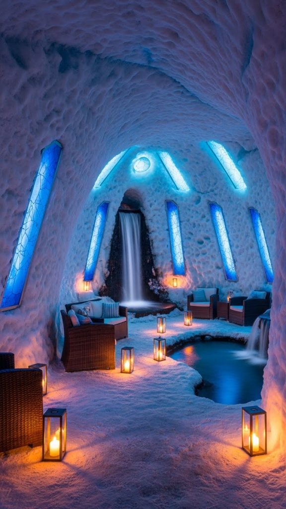 The ice cave retreat blends nature with comfort, creating a serene and artistic winter home.