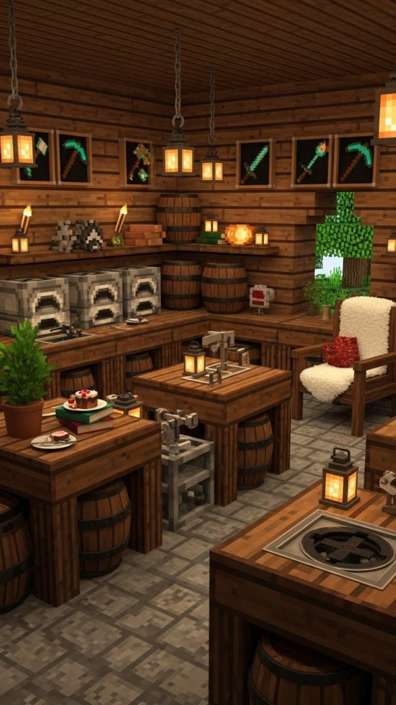 Decorate with item frames showing tools, barrels for storage, and lanterns for lighting. Add plants or carpets to soften the space.