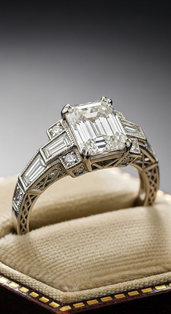 The Art Deco era (1920s–1930s) was all about geometric shapes, bold lines, and symmetry. An emerald-cut diamond surrounded by smaller baguette diamonds creates a striking centerpiece.