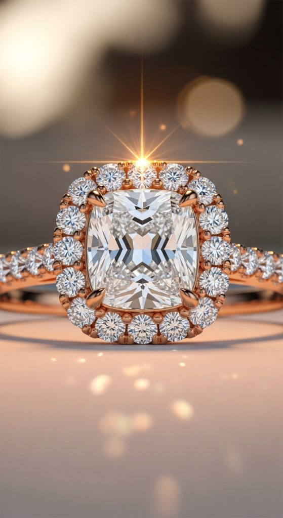 Halo settings have been around for centuries, but a vintage halo design brings old-world charm. A cushion-cut diamond surrounded by smaller diamonds creates a soft, romantic glow.