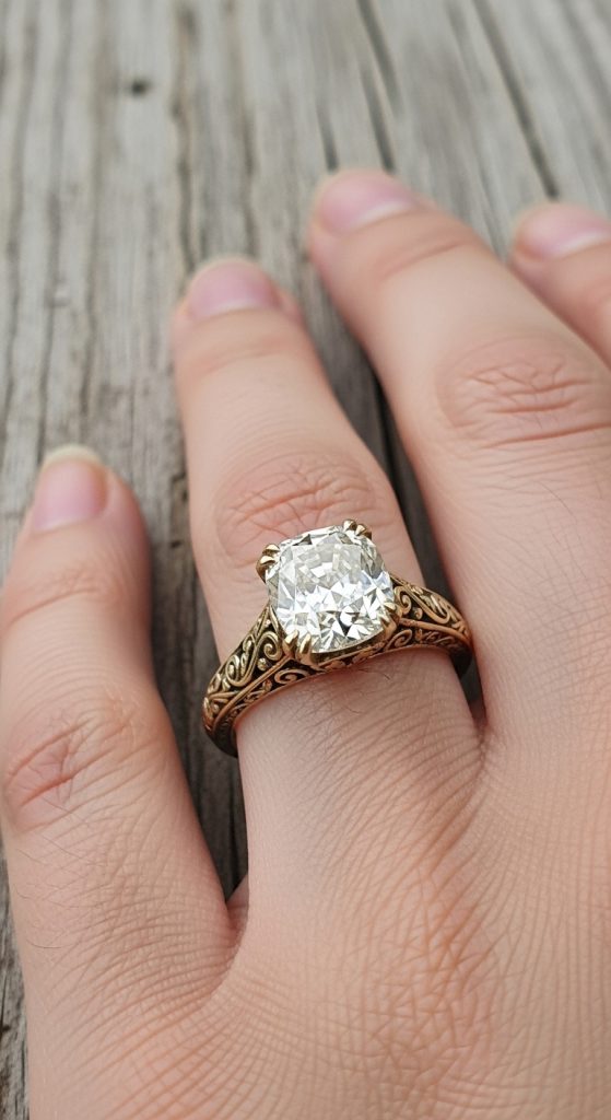 6. Old Mine Cut Diamond with Engraved Band