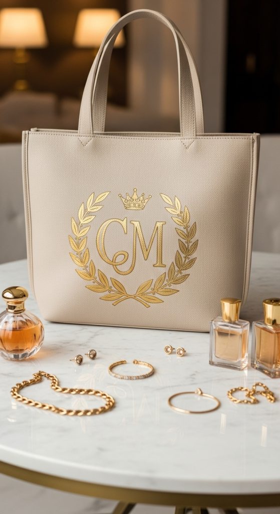 Think designer vibes—personalized initials with golden accents. A monogram design gives a tote bag a sophisticated and luxurious look, perfect for stylish women who love custom pieces.