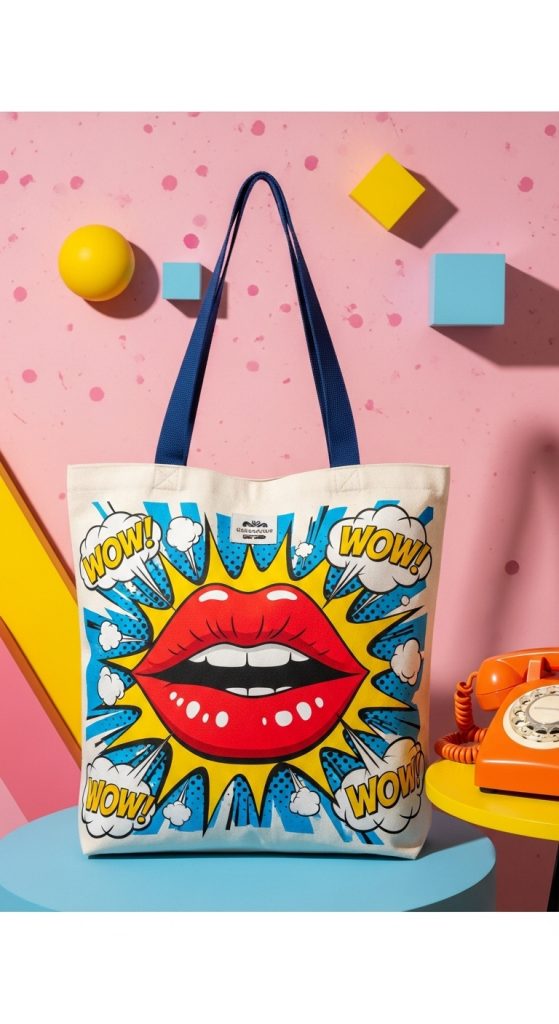 If you love bold, retro designs, a pop art tote bag is for you. Think comic book speech bubbles, exaggerated expressions, and vibrant contrasts.