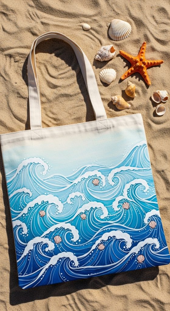 A tote bag with ocean waves and seashells painted on it feels refreshing and calming. Perfect for beach trips or summer vacations.