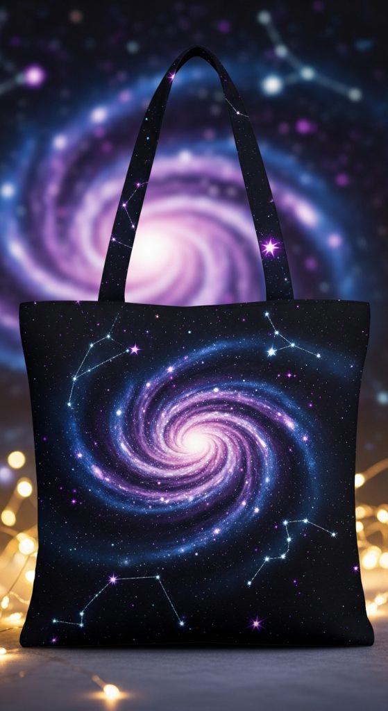 A cosmic-themed tote bag instantly turns heads. Deep purples, midnight blues, and glittery stars create a magical vibe. Inspired by Van Gogh’s “Starry Night,” galaxy designs are perfect for dreamers and stargazers.