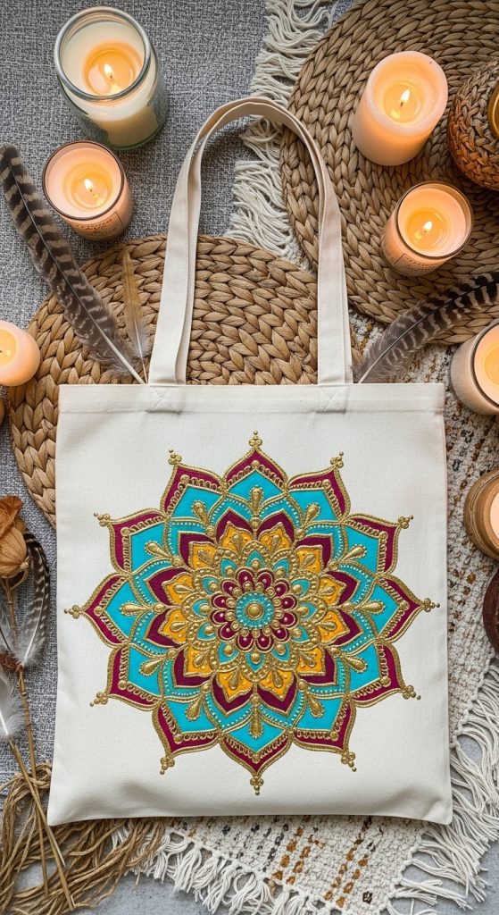 Mandala designs radiate peace and creativity. With their symmetrical beauty and detailed patterns, they look gorgeous on tote bags. Boho lovers adore this design for festivals, yoga sessions, and daily casual wear.