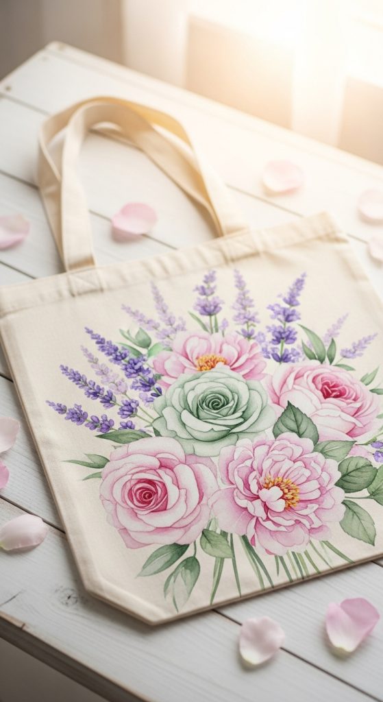 Nothing screams timeless elegance like delicate watercolor flowers. Imagine soft pastel roses, lavender sprigs, and peonies painted across a plain cotton tote. This style creates a dreamy, romantic look perfect for spring or summer outings.