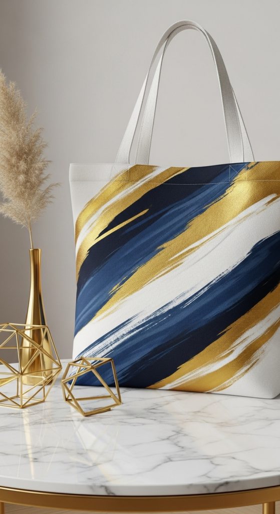 Bold, modern, and effortlessly stylish—abstract brush strokes make your tote look like wearable art. This style is about mixing colors and creating movement on fabric. Think large, imperfect swipes of gold, navy, and white.