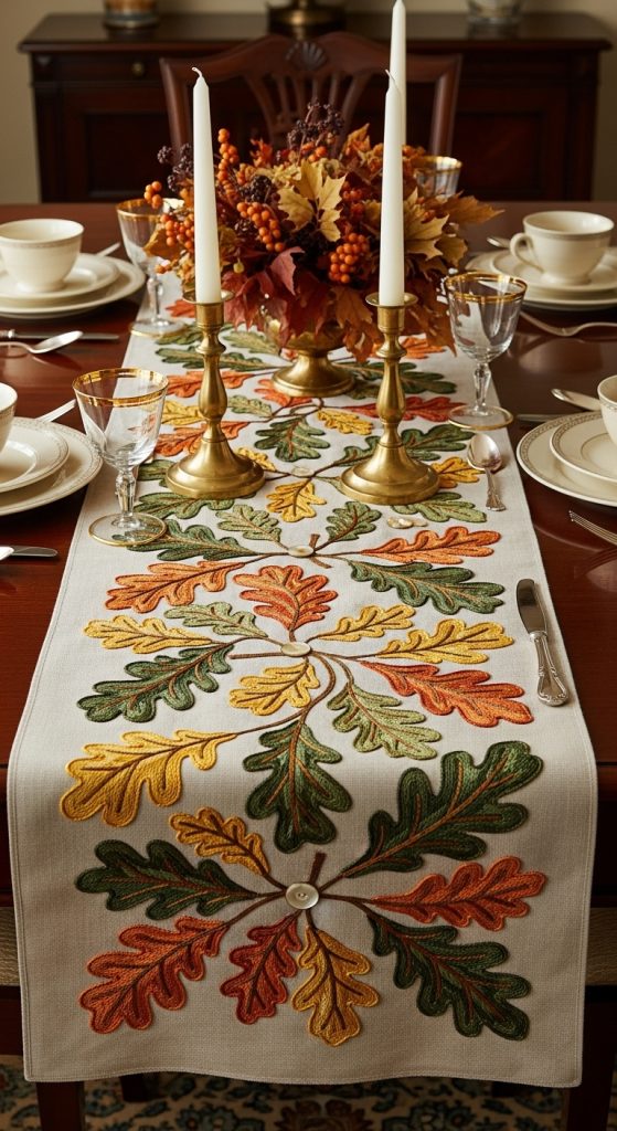 Craft a linen or cotton table runner embroidered with fall motifs—oak leaves, acorns, pumpkins—and enhanced with vintage buttons (brass, mother-of-pearl, pressed glass) for elegant detail.
