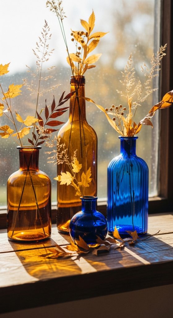 Collect vintage glass bottles (amber-glass, cobalt, clear with embossing), and arrange autumn stems—seed pods, dried grasses, branches with leaves turning colour—for a minimalist yet vintage botanical statement.