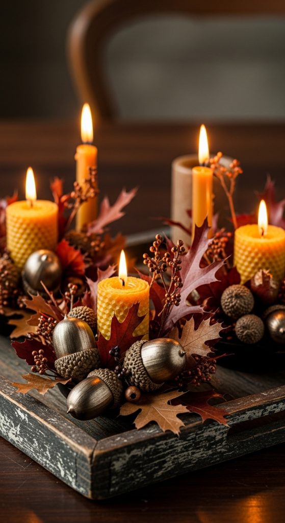 Create candle holders featuring real acorns, oak leaves, and metallic finishes—blending rustic harvest materials with a luxurious shine.