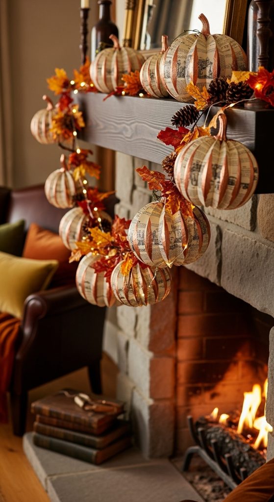 Using old book pages brings history and texture. The worn edges, yellowed paper and faint type create a vintage aesthetic that contrasts beautifully with the seasonal motif of pumpkins and harvest. It’s craft that elevates simple paper into décor with character.