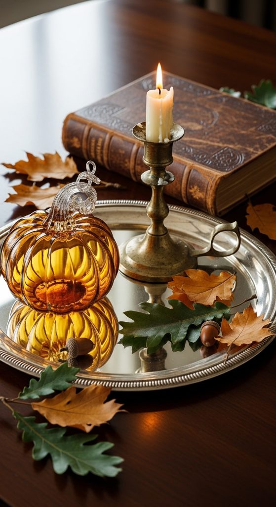 Repurpose a vintage mirror tray (silver-plated, brass rim, or aged glass) and adorn it with mini décor elements: small faux pumpkins, pine cones, weathered books, and a nostalgic photograph for an elegant vignette.