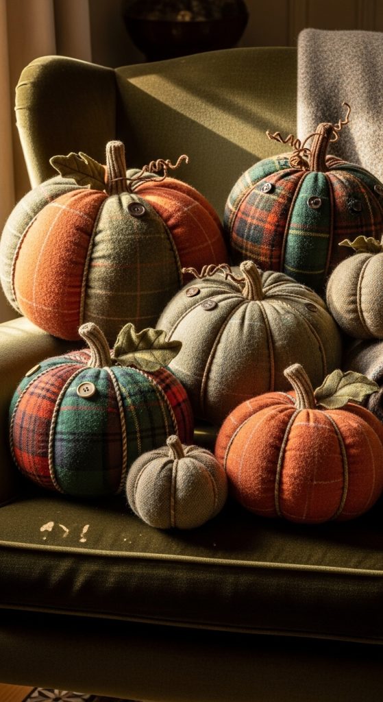 Sew or stitch soft pumpkins for pillows using vintage-inspired fabrics — think wool tweed, old tartan, linen with patina — and display them as seasonal décor on sofas or beds.