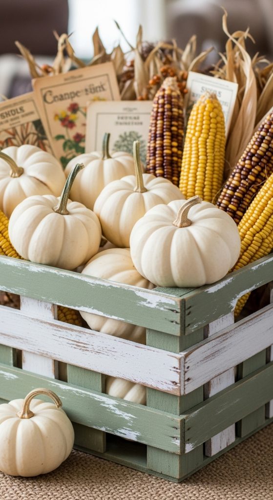 Build (or repurpose) a small wooden crate with a distressed paint finish and fill it with seasonal natural elements: mini‐pumpkins, gourds, dried corn, vintage tickets or seed packets. Use it as a centrepiece or side-table accent.
