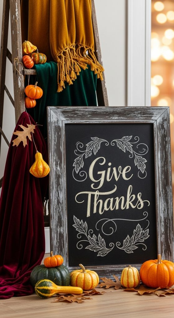 - Lettering: Using chalk or chalk‐marker, write your phrase in a decorative script. Add simple leaf or acorn motifs around the edges.