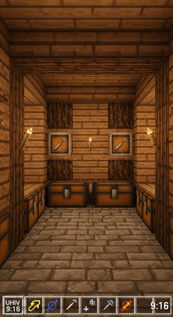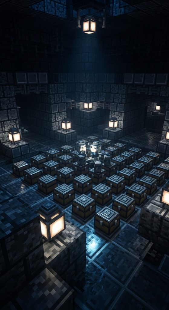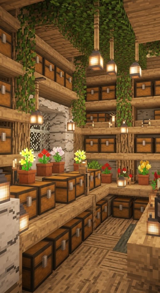 If you love a warm, cozy, medieval atmosphere, this design is perfect. Using classic materials like oak, spruce, and stone bricks, this chest room feels timeless. The high wooden beams and lantern lighting create a natural ambiance that fits perfectly in castles, underground bases, or rustic villages.