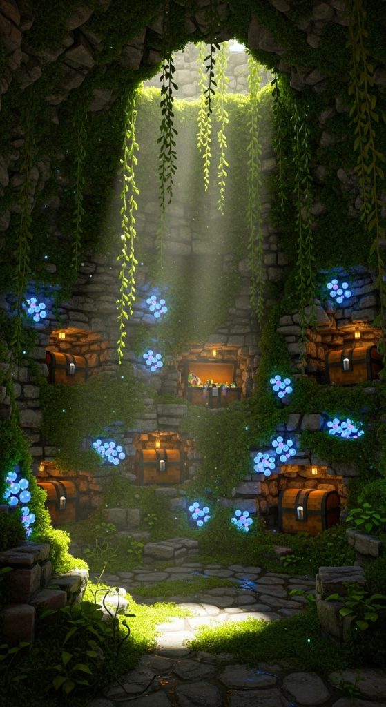 A chest room designed inside a raw, organic cave style is perfect for players who like natural builds. With vines, mossy blocks, and textured stone, this design blends nature with storage functionality.