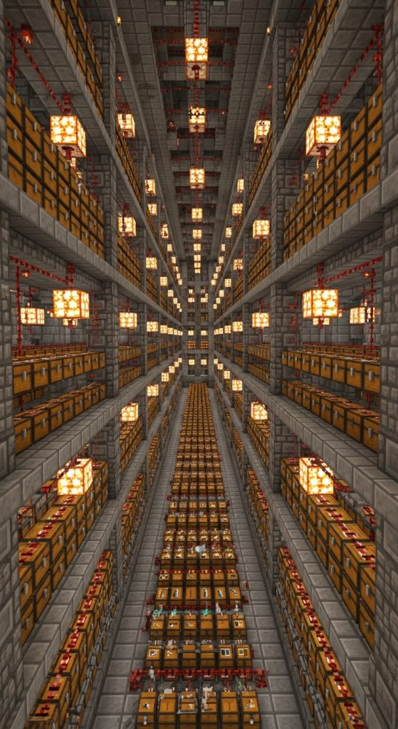 For technical players, an auto-sorting chest room is the ultimate dream. This massive setup uses automated redstone hoppers and comparator systems to sort items automatically.