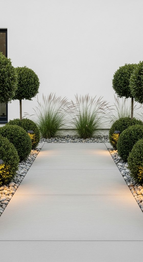 A well-designed minimalist pathway doesn’t just guide visitors to your door—it creates a serene, sculptural experience. Use materials like concrete slabs, slate, or river stones, paired with easy-care plants such as boxwood, ornamental grasses, or dwarf olive trees. Add a narrow LED border light for a soft nighttime glow.