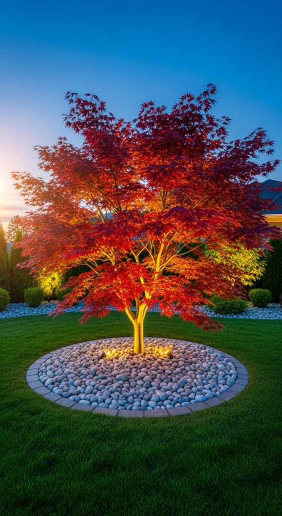 Pairing the tree with low groundcover plants or small ornamental grasses helps complete the polished look.
