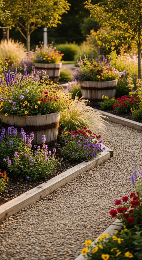 Rustic landscaping celebrates natural textures—raw wood, weathered stone, warm lighting, and lush greenery. Think reclaimed wood borders, wooden planters, log seating, and winding gravel paths.