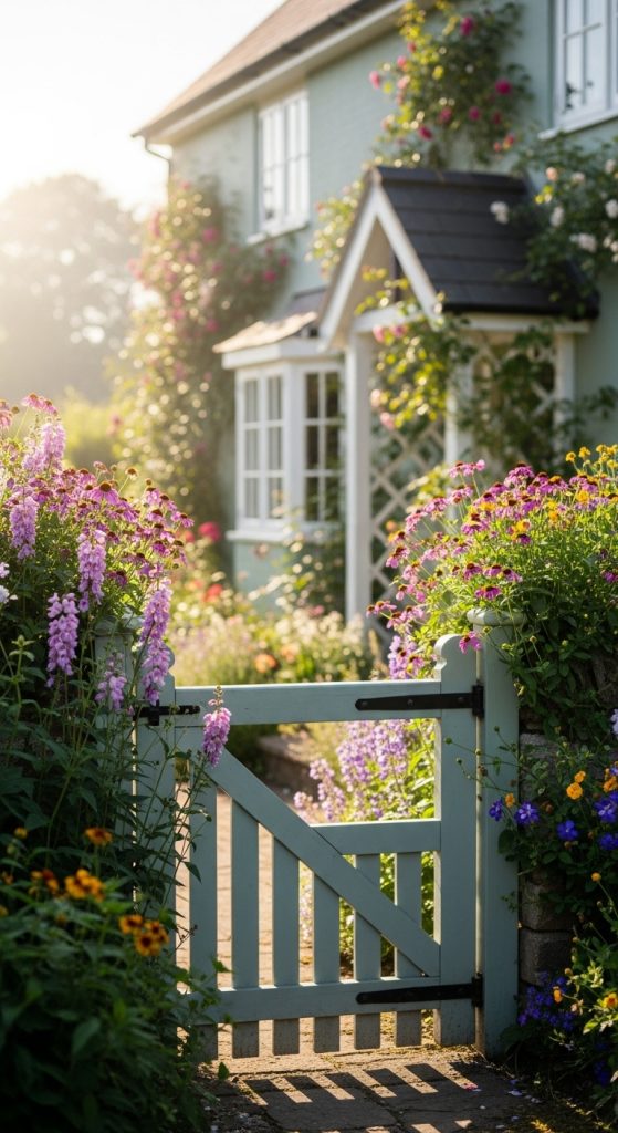 Layered flower beds with roses, daisies, lavender, salvia, and peonies create a full, romantic atmosphere. Add a rustic white or pastel wooden gate and winding stone path to enhance the charm.