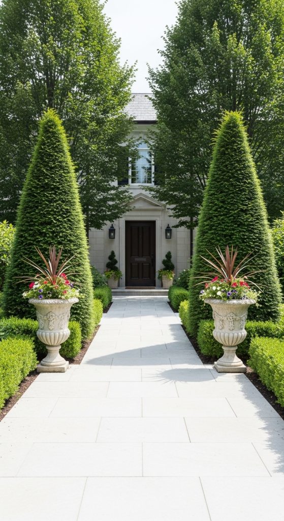 For a classic, polished look, symmetry is the secret weapon. Placing identical planters, shrubs, or small trees on each side of your walkway or front door creates instant elegance.