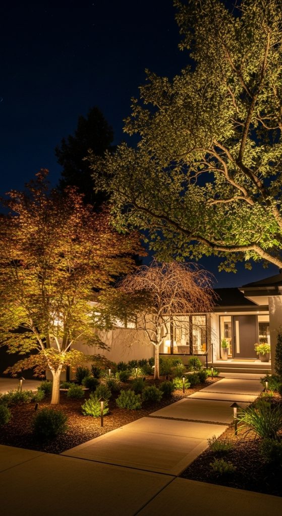 Landscaping doesn’t end at sunset. With well-placed lighting, your front yard transforms into a warm and inviting nighttime scene.