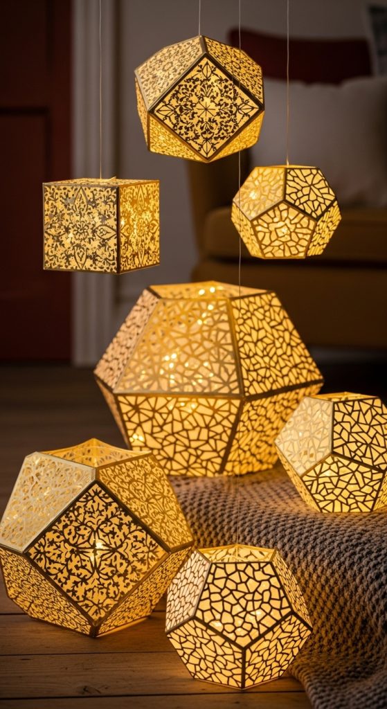 Transform ordinary paper into glowing luxury with gold-leaf detailing. These paper lanterns can be simple geometric shapes or intricate cut-out patterns that shimmer when illuminated by fairy lights. Ideal for indoor decoration, parties, or cozy reading corners, they add a magical glow and elegance to any room.