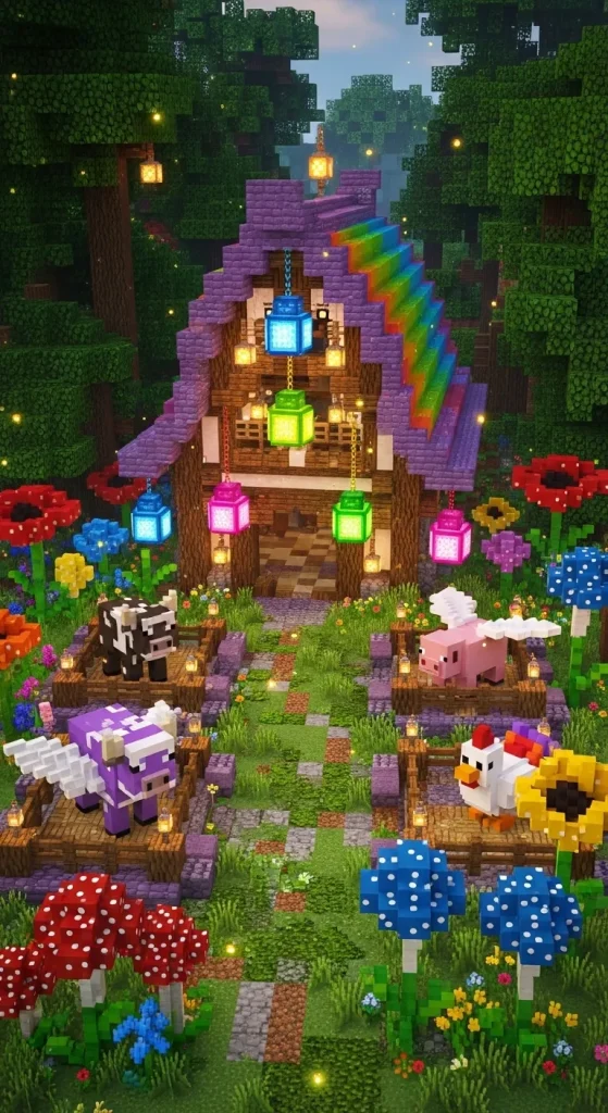 This barn can use warped wood, glowing lanterns, colorful roofs, and unique shapes. Animal pens can include flowers, glowing mushrooms, and decorative fences.