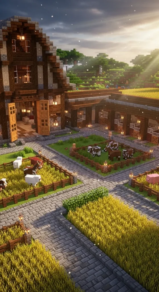 Minecraft farms are not just about survival — they are about creativity, beauty, and building a peaceful world filled with life. A well-designed barn with animal pens and stables can transform a simple farm into a charming countryside paradise. Whether you keep cows, horses, sheep, pigs, or chickens, a beautiful barn adds character and makes your world feel alive.