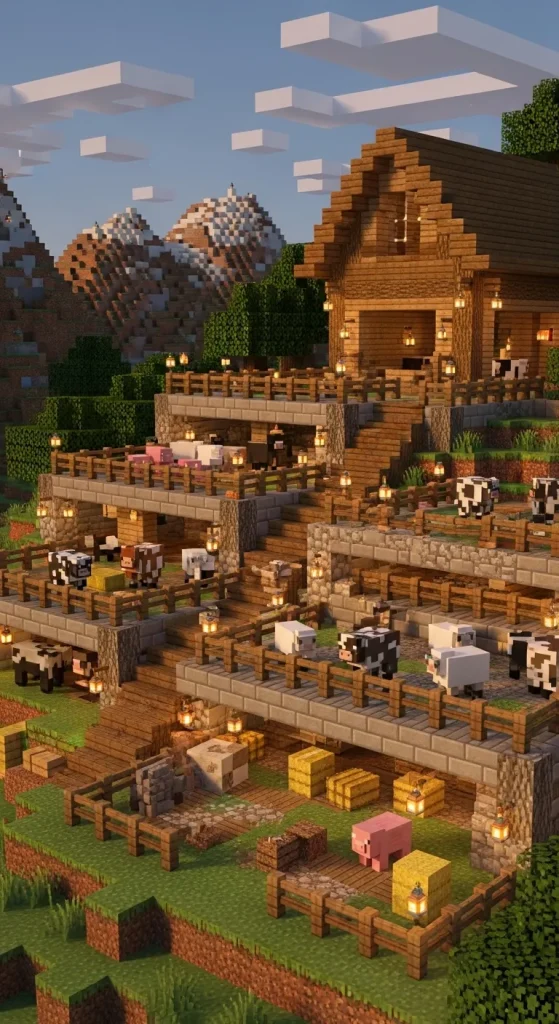If your Minecraft world has mountains or hills, building a mountain barn with terraced animal pens creates an amazing landscape farm.
